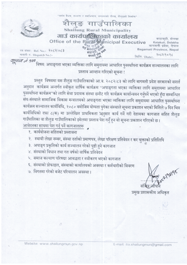 अपाङ्गता भएका व्यक्तिका लागि समुदायमा आधारित पुनर्स्थापना कार्यक्रम सञ्चालनका लागि प्रस्ताव आव्हान गरिएको सूचना