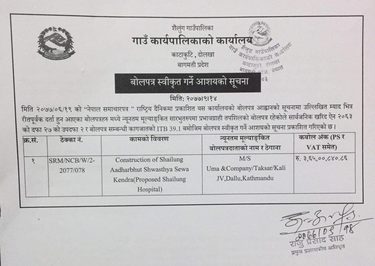 बोलपत्र स्वीकृत गर्ने आशयको सूचना