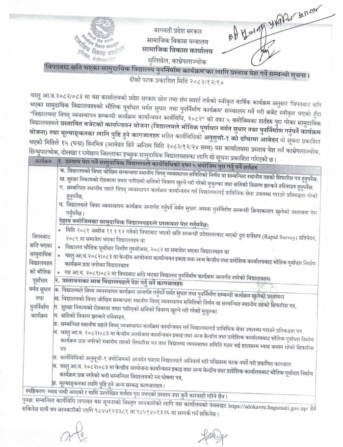 विपदबाट क्षति भएका सामुदायिक विद्यालय पुननिर्माण कार्यक्रमका लागि प्रस्ताव पेश गर्ने सम्बन्धी सूचना